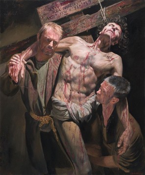 答:在我看来,一幅真正好的具象画总是能找到讽刺和现实主义之间的平衡,艺术家通过笔触捕捉了模特,而这些笔触仍然清晰可见。保持粗糙感,而不被诱惑在作品变得像照片之前就把人物勾画得太平滑。艺术深入到摄影无法追随的层次是极其重要的。照片不包含气质,只有艺术家才能通过眼睛、心智、技巧、经验,以及手中的画笔,去展现这一点。那是对生活的诠释。《圣玛丽·玛格达琳的圣血》原本是一幅肖像委托画,但将模特置于历史和宗教背景中,可能会为某些观众创造情感上的困境。在这个同情心短缺的时代,某些人可能会觉得共鸣是一件困难的事。
