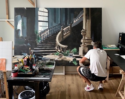 最后,“黑暗中的光”系列进一步深化了主题的哲学维度,探索光明与黑暗的二元性。例如,一幅破败楼梯在微弱光束照射下的描绘:楼梯的边缘布满裂痕,阴影吞噬大部分空间,却有一缕光线从上方渗入,勾勒出尘埃飞舞的瞬间。这种意象直接源于海茨内心的情感投射,他描述道:“色彩黯淡,笔触粗犷,光线微弱……这就是我内心的感受,也是我在这片空白画布上所呈现的。”