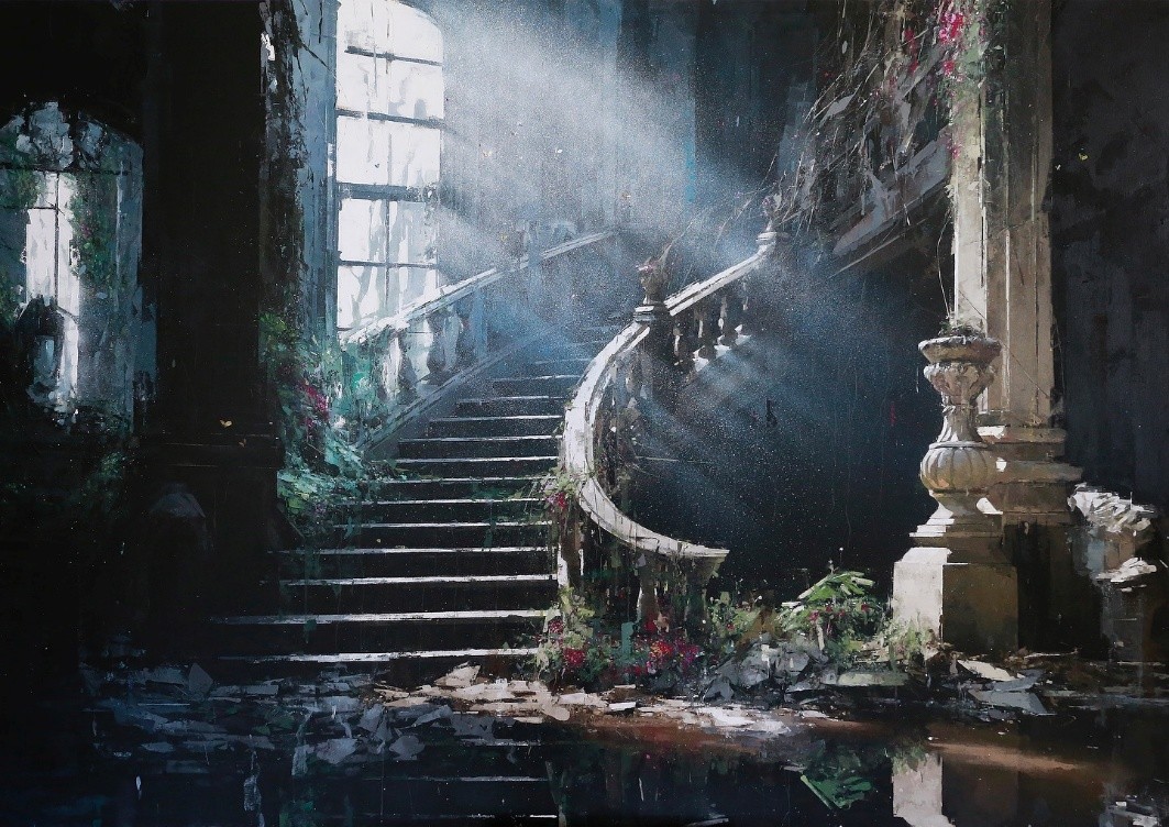 在当代性上,这一主题回应了后疫情时代的精神困境:全球范围内,人们在经济衰退、心理创伤和不确定性中寻求希望。楼梯象征上升的努力,却被黑暗包围,寓意在“令人心碎的黑暗中看到一丝光亮”。这与存在主义哲学和当代心理疗愈艺术相呼应,鼓励观众在废墟中寻找内在韧性。他的作品如“碎片化的过去明信片”,捕捉人类灵魂的永恒冲突, 在当下焦虑社会中,提供了一种疗愈性的叙事,强调希望并非宏大叙事,而是微光中的坚持。