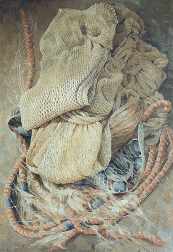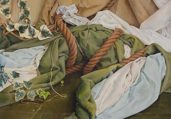 在准备静物作品时,我通常以一种非常直觉的方式选择物品,让自己被当下吸引或触动的事物所引导。这些往往是一些简单的对象,如织物、绳索、水果或植物,但我真正关注的并不是它们的客观存在,而是它们在空间中所形成的关系。我喜欢将构图想象为一个舞台,绘画成为一场微型的戏剧表演,其中的物体仿佛扮演着演员或角色。