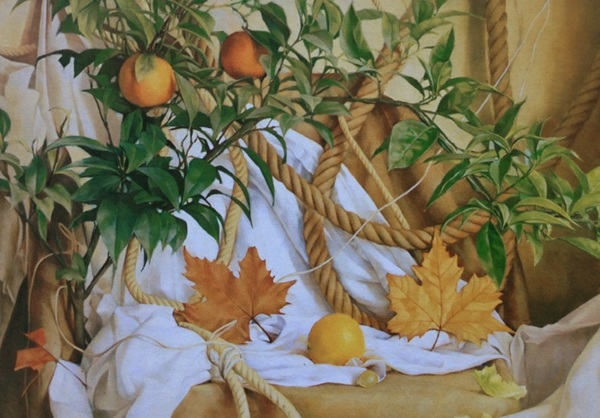 在准备一幅静物作品时,我首先会在眼前构建一个类似“舞台”的空间,让物品成为我画面中的“演员”。我喜欢将无生命的物体——如织物、绳索或其他材料——与具有生命特征的元素组合在一起,例如生长中的植物、果实,或正在枯萎或发芽的叶子。我对“静止”与“变化”之间的对比尤为感兴趣。在绘画过程中,这种关系不断发生变化,空间与体积、无生命与有生命之间的关系也随之转化,仿佛这些物体在画面中开始“呼吸”与“运动”。通常,当画面看似完成之后,我仍会对某些细节进行再次修改,使其保留创作过程中变化的痕迹。我希望在作品中传达一种“希望感”。即便一切似乎静止甚至失去生命,仍会有某种生命的萌芽出现,并带来新的力量与对未来的信心。从这个意义上说,静物与肖像之间具有某种共通性:画面看似静止,但其中始终存在一种随时间展开的生命张力。正如面部表情可以保持不变,而目光却透露出正在生成的思想。