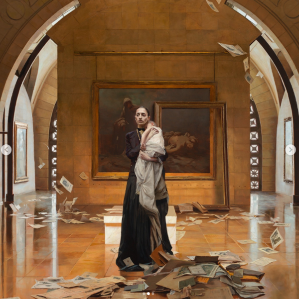 作者解读:这幅画重新诠释了索福克勒斯笔下的悲剧女主人公安提戈涅,她傲然屹立于一座宏伟却残破的画廊之中。她怀抱着一个孩子——这象征着她的儿子,这个孩子出现在欧里庇得斯已佚失的剧作《后裔》中——寓意着反抗和传承的深远影响。在她身后,悬挂着尼基弗罗斯·吕特拉斯创作于1865年的画作《安提戈涅面对死去的波吕尼克斯》,将这幅作品牢牢地锚定在古典和艺术史的传统之中。空荡荡的画框和散落的纸张则暗示着抹去、遗忘的记忆以及文化传承的脆弱。