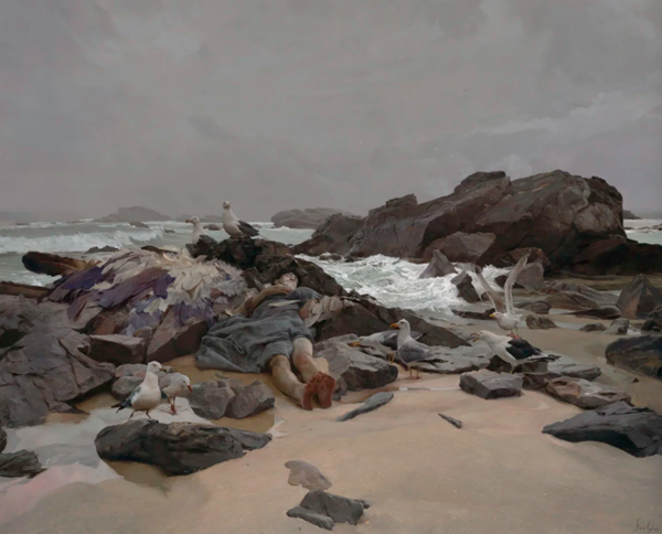 我不确定自己能完全克服这个局限。我想最简单的方法是通过作品暗示运动,让观众产生好奇:刚才发生了什么,接下来会发生什么,从而感知时间的流逝。例如,《Antigone》中风的吹动、落下的纸张,或《Icarus Fallen》中拍打的海浪与飞翔的鸟群,都有助于避免在本质上静止的画面中产生僵化感。当然,笔触以及其他动态的手法,例如凝视,也起到极大作用。关键是不要过度。我必须承认,我在这方面从不满足;只要让我长时间与一幅作品相处,我总会想重做整个画面。我想,这大概就是所谓“自信的骗子艺术”吧。