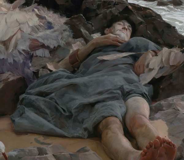 实际上,我最初被伊卡洛斯坠落的形象吸引,并非来自阅读奥维德的作品,而是通过阅读香特尔·德尔索尔(Chantel Delsol)的《Icarus Fallen》。德尔索尔的作品探讨了在失去以往超越理想的现代背景下,个体的命运问题(例如宗教作为社会凝聚力的衰落,以及自由主义、共产主义、世俗主义等大型启蒙计划未能兑现其承诺)。在这里,伊卡洛斯不再是傲慢的象征,而成为迷失方向的象征。他飞得太接近太阳(象征对超越理念的崇高追求),却未受到惩罚。在德尔索尔对神话的运用中,伊卡洛斯醒来后在一个失去以往确定性的世界中徘徊。这一瞬间对我而言非常有趣——正好在坠落之后,呈现出昏迷而非死亡的状态。他醒来后,将如何看待这个世界?这并不意味着我完全赞同德尔索尔的论点,但正是这一思想启发了我创作这幅画。