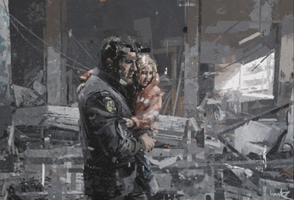 3、作为一位西班牙艺术家,是什么样的契机或强烈的情感驱动,让您将目光投向遥远的叙利亚战争这一沉重议题 ?在您描绘“父亲带着幼女逃离叙利亚”的作品中,您是如何处理“绝望中的温情”或“毁灭中的希望”这类极端复杂且矛盾的情感的?这幅画的背后,是否有一个真实或想象中的故事作为蓝本?