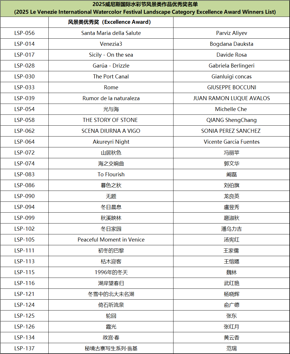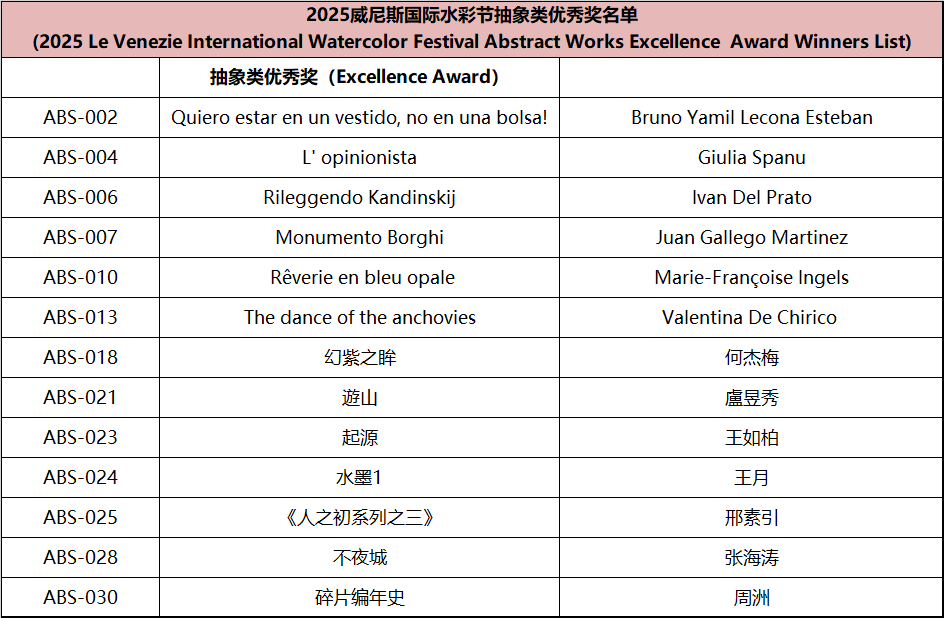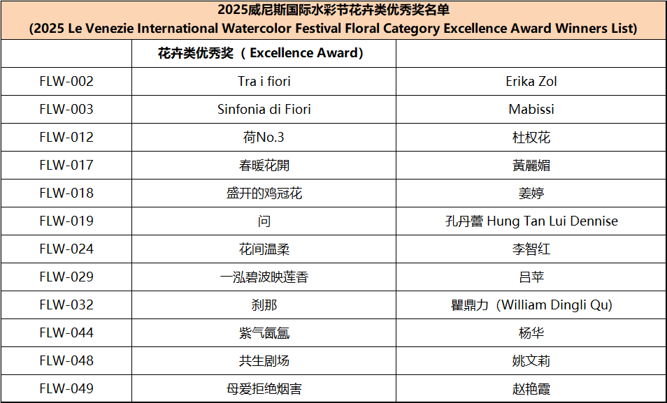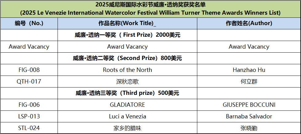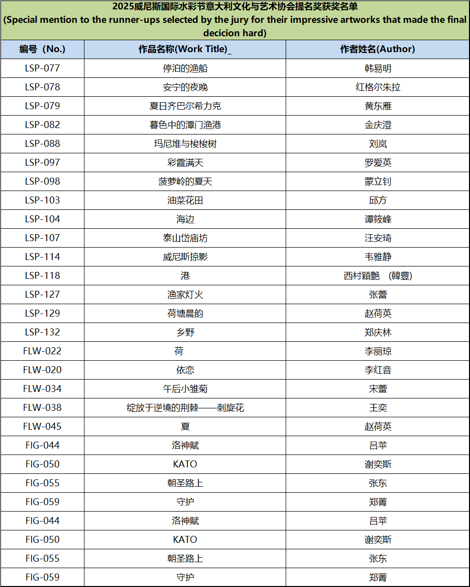 Since the announcement of the Watercolor Festival information, it has received active responses and widespread support from domestic and international artists, faculty and students from art academies, and watercolor enthusiasts. This edition of the festival received submissions from watercolor artists and art enthusiasts from nearly twenty countries, including Italy, Spain, France, Germany, Greece, Sweden, Poland, Algeria, Belgium, Switzerland, Australia, Turkey, Canada, Belarus, Azerbaijan, the United States, and Mexico. In accordance with the festival rules, after two rounds of rigorous review by more than ten international judges from Italy, Spain, Ireland, and China, the winning works for each award have been finalized, Special mention to other artists for their remarkable artworks (Excellence Award) . The review results are announced as follows: